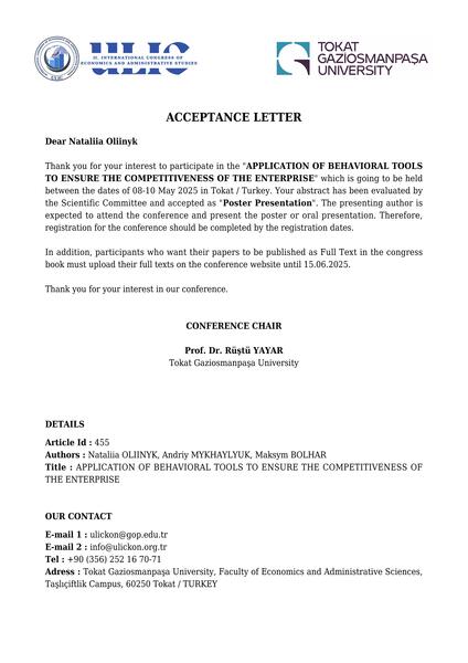 | Участь у роботі ІІ Міжнародної науково-практичної конференції «International Congress on Economic and Administrative Studies (ULIC-2025)», 8-10 травня 2025 р. |