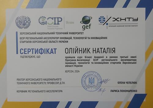 | Навчання за курсом Бізнес Академії в рамках третьої хвилі Програми Акселерації GCIP регіонального акселератора інновацій, технологій та інноваційних стартапів Херсонської області України. Сертифікат від 16.04.2024 р. – 09.05.2024 р |
