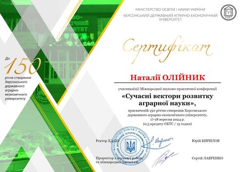 | Участь у Міжнародній науково-практичній конференції «Сучасні вектори розвитку аграрної науки», присвяченій 150-річчю створення Херсонського державного аграрно-економічного університету, Сертифікат від 17-18 вересня 2024 р. |