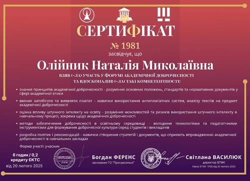 | Участь у Форумі академічної доброчесності. Сертифікат № 1981 від 20.02.2025 р. |