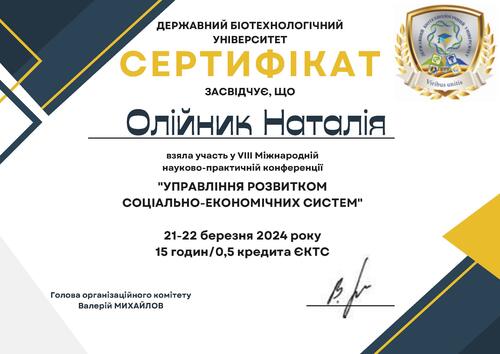 | Участь у VIII Міжнародній науково-практичній конференції «Управління розвитком соціально-економічних систем». Сертифікат від 22.03.2024 р. |