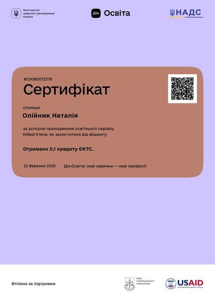 | Проходження навчального онлайн-курсу «Кібергігієна: як захиститися від фішингу» на платформі «Дія.Освіта». Сертифікат № С0080072378 від 22.03.2025 р. |