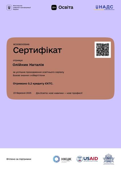 | Проходження навчального онлайн-курсу «Освітній серіал: Базові знання з кібергігієни» на платформі «Дія.Освіта». Сертифікат № С0080105946 від 23.03.2025 р. |