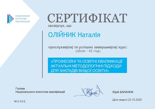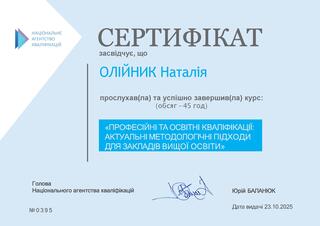 | Проходження онлайн-курсу підвищення кваліфікації «Професійні та освітні кваліфікації: актуальні методичні підходи для закладів вищої освіти» розробленого Національним агентством кваліфікацій за підтримки проєкту Skills4Recovery. Сертифікат № 0395 від 23.10.25 р. |