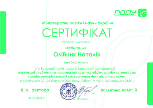 | Участь у VI Всеукраїнській науково-практичній конференції «Актуальні проблеми та перспективи розвитку обліку, аналізу та контролю в соціально-орієнтованій системі управління підприємством». м. Полтава. Сертифікат № СС00493014/001850-23 від 31.03.2023 р. |