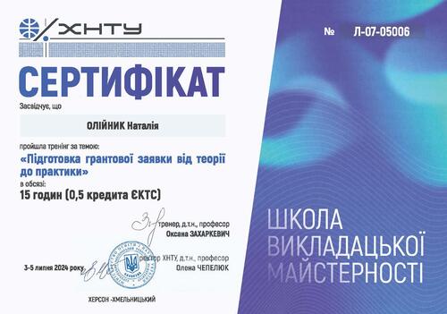 | Проходження програми в Зимовій економічній школі «Україна-ЄС, кроки до вступу: регіональний вимір» від ВГО «Українська Асоціація Економістів-міжнародників» та Хмельницького національного університету. Сертифікат від 25-31 січня 2024 р. |