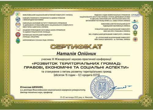 | Участь у ІІІ Міжнародній науково-практичній конференції “Розвиток територіальних громад: правові, економічні та соціальні аспекти" та стажування з питань розвитку територіальних громад. Сертифікат від 02.11.2023 р. |