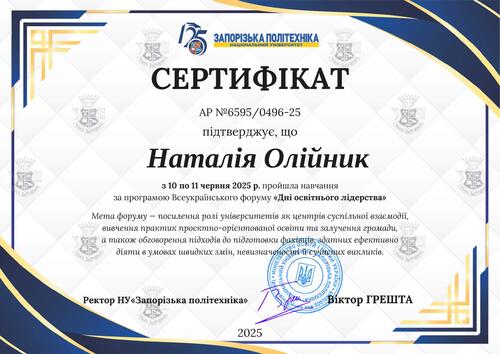 | Навчання за програмою Всеукраїнського форуму «Дні освітнього лідерства» (10-11 червня 2025 р.). Сертифікат АР № 6595/0496-25 |