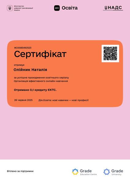 | Проходження навчального онлайн-курсу «Освітній серіал: Організація ефективного онлайн-навчання» на платформі «Дія.Освіта». Сертифікат № С0085492523 від 26.06.2025 р. |