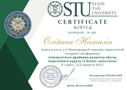 | Участь у ІІ Міжнародній науково-практичній інтернет-конференції "Синергетичні драйвери розвитку обліку, податкового аудиту та бізнес-аналітики". Сертифікат №107 СД від 28.04.2023 р. |