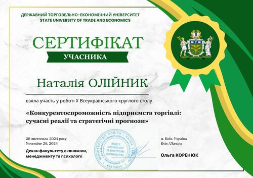 | Участь у Х Всеукраїнському круглому столі «Конкурентоспроможність підприємств торгівлі: сучасні реалії та стратегічні прогнози», Державний торговельно-економічний університет. Сертифікат від 26 листопада 2024 р. |