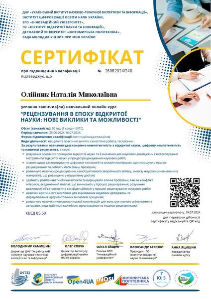 | Проходження навчального онлайн-курсу «Рецензування в епоху відкритої науки: нові виклики та можливості» (25.06.-16.07.2024 р.). Сертифікат 25062024/348 від 29.07.2024 р. |