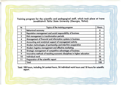 | Th e International Scientific Internship «Methodology and Innovative Business Tools of Foresight Management» (Tbilisi, Georgia). Training program for the scientific and pedagogical staff, which took place at Ivane Javakhishvili Tbilisi State University: 108 hours, including 54 contact hours, 36 individual work hours and 18 hours for scientific report, (Certificate of Completion № 1009, 24-30 October, 2017). |