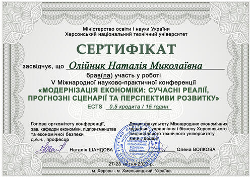 | Участь у V Міжнародній науково-практичній конференції “Модернізація економіки: сучасні реалії, прогнозні сценарії та перспективи розвитку". Сертифікат від 28.04.2023 р. |