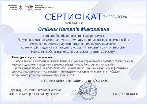 | Участь у Всеукраїнському науково-практичному семінарі «Інноваційні освітні технології та методики навчання: актуальні питання, досвід упровадження» в рамках Шістнадцятої міжнародної виставки «Інноватика в сучасній освіті». Сертифікат № ПК2024/10080 від 24.10.2024 р. |