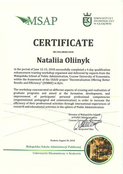 | Учасник тренінгу «Децентралізація приносить кращі результати та ефективність» (DOBRE), організованого та проведеного Малопольською школою публічного адміністрування Краківського економічного університету в рамках проекту USAID: |