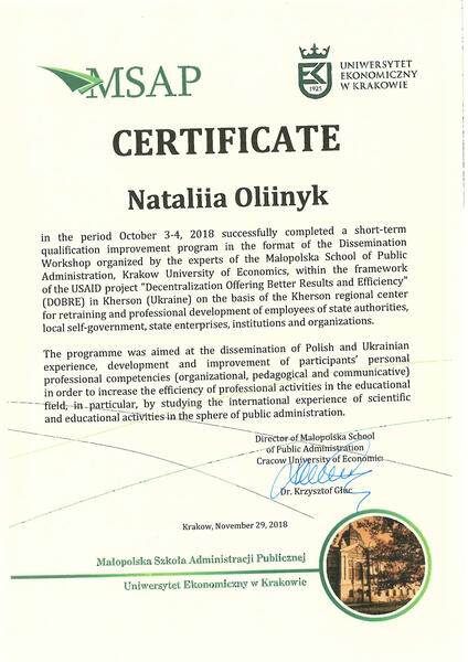 | Malopolska School of Public Administration, Cracow University of Economics, short-term qualification improvement program in the format of the Dissemination Workshop within the framework of the USAID project «Decentralization Offering Better Results and Efficiency». 03-04.10.2018 |