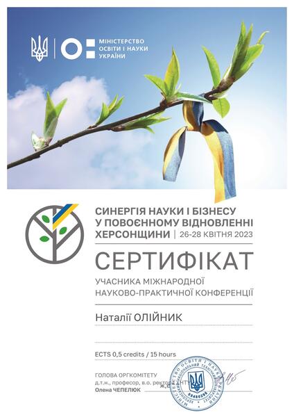 | Участь у Міжнародній науково-практичній конференції «Синергія науки і бізнесу у повоєнному відновленню Херсонщини». Сертифікат від 28.04.2023 р. |