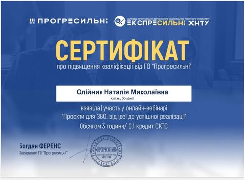 | Участь у онлайн-вебінарі «Проєкти для ЗВО: від ідеї до успішної реалізації». Сертифікат про підвищення кваліфікації від ГО "Прогресильні". 22.02.2024 р. |