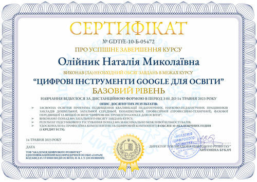 | Навчання за програмою підвищення кваліфікації «Google Digital Tools for Education/ Цифрові інструменти Google для освіти», організоване Міністерством освіти і науки України за підтримки Google Україна: Сертифікат про завершення базового рівня курсу №GDTfE-10-Б-05472 від 14.05.2023 |