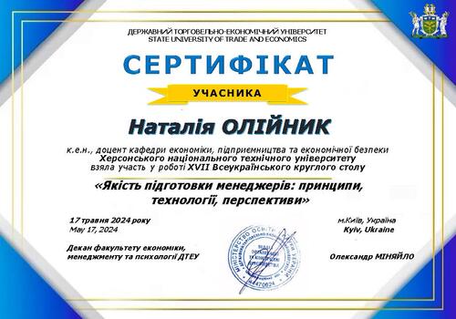 | Участь у ХVІІІ Всеукраїнському круглому столі "ЯКІСТЬ ПІДГОТОВКИ МЕНЕДЖЕРІВ: ПРИНЦИПИ, ТЕХНОЛОГІЇ, ПЕРСПЕКТИВИ". Сертифікат учасника від 17.05.2024 р. |