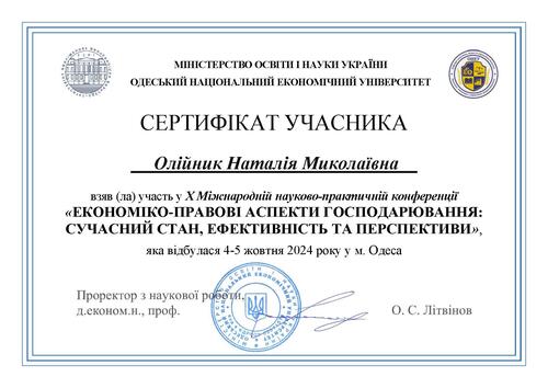 | Участь у роботі Х Міжнародної науково-практичної конференції «Економіко-правові аспекти господарювання: сучасний стан, ефективність та перспективи», м. Одеса, Одеський національний економічний університет. Сертифікат від 4-5.10.2024 р. |