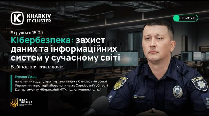 Спікером виступив Руслан СЕНЬ - начальник відділу протидії злочинам у банківській сфері Управління протидії кіберзлочинам в Харківській області Департаменту кіберполіції Національної поліції України, підполковник поліції.