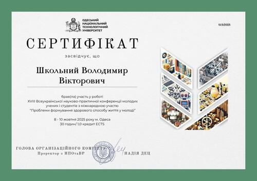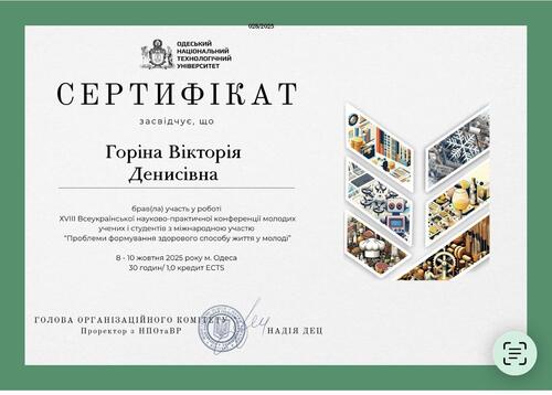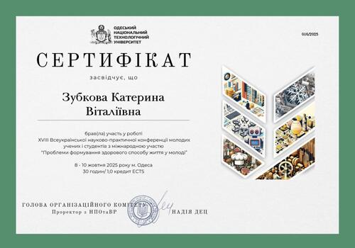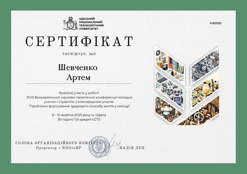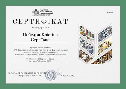 8–10 жовтня 2025 року на базі Одеського національного технологічного університету відбулася XVIII Всеукраїнська науково-практична конференція молодих учених і студентів з міжнародною участю «Проблеми формування здорового способу життя у молоді». Захід об’єднав здобувачів вищої освіти, молодих дослідників та наукових керівників з різних регіонів України.