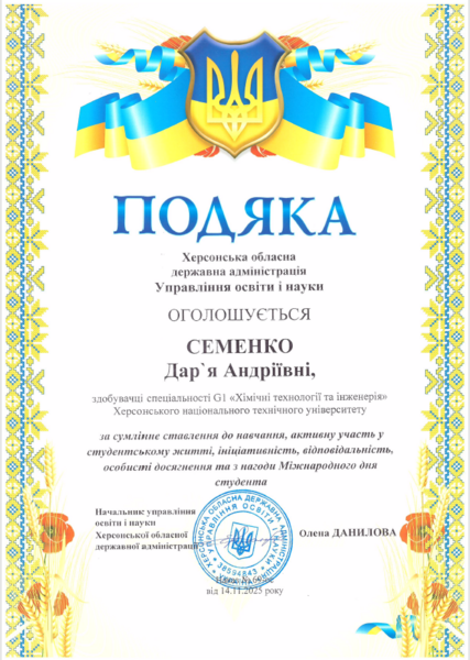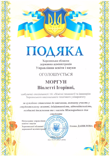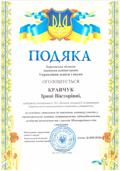Відповідно до наказу № 69-ос від 14 листопада 2025 року, Управління освіти і науки Херсонської обласної державної адміністрації оголосило Подяку талановитим здобувачкам нашого університету спеціальності G1 «Хімічні технології та інженерія» освітньої програми «Хімічні технології харчових добавок та косметичних засобів» Семенко Дар’ї Андріївні група 5Хк, та випускницям другого (магістерського) рівня Кравчук Ірині Вікторівні і Моргун Віолетті Ігорівні.