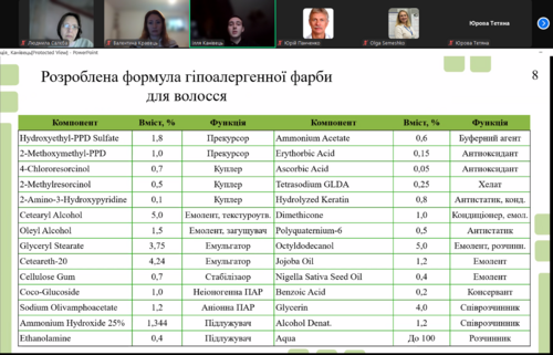 У кваліфікаційних роботах магістрів освітньо-професійної програми «Хімічні технології харчових добавок та косметичних засобів» було досліджено рецептури піномийних косметичних засобів – гелів для душу на основі синтетичних та натуральних поверхнево-активних речовин; проведено широке дослідження питань виникнення і способів боротьбі із таким захворюванням, як лупа; розроблено рецептуру, технологію виготовлення і досліджено властивості отриманих твердих шампунів проти лупи на основі натуральних компонентів; проведено синтез та надано характеристику аморфного діоксиду кремнію з природної мінеральної сировини; розроблено рецептуру та технологію приготування гіпоалергенної окисної фарби для волосся та активатора на основі компонентів із незначним алергенним потенціалом, розроблено більш селективний та ефективний метод визначення сенсибілізуючого потенціалу фарби для волосся; проведено дослідження рецептури фарби на основі хни; досліджено технологію виробництва косметичних кремів на ламелярній основі.