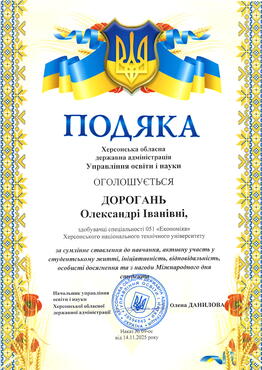 З нагоди Міжнародного дня студента студенти кафедри були відзначені Подяками Управління освіти і науки Херсонської обласної державної адміністрації за сумлінне ставлення до навчання, активну участь у студентському житті, ініціативність, відповідальність та вагомі особисті досягнення. Подяки отримали Олександра Дорогань та Дмитро Данюк - студенти спеціальності 051 "Економіка", які протягом навчання неодноразово гідно представляли кафедру та Херсонський національний технічний університет на всеукраїнських і міжнародних заходах.