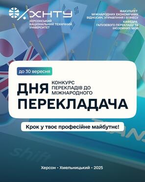 Кафедра галузевого перекладу та іноземних мов Херсонського національного технічного університету запрошує здобувачів вищої і загальної середньої освіти взяти участь у Конкурсі перекладів до Міжнародного дня перекладача!