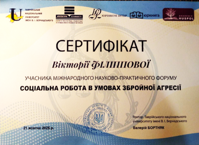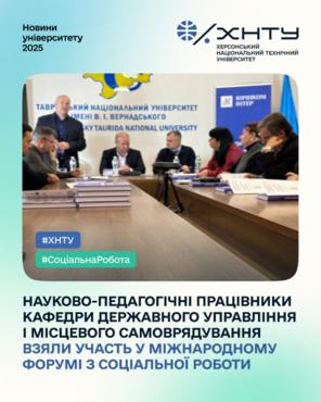 21 жовтня 2025 року Науково-педагогічні працівники кафедри державного управління і місцевого самоврядування ХНТУ на чолі із завідувачем кафедри, д. держ. упр., професором Вікторією ФІЛІППОВОЮ взяли участь у Міжнародному науково-практичному форумі «Соціальна робота в умовах збройної агресії».