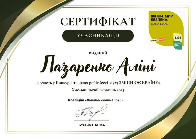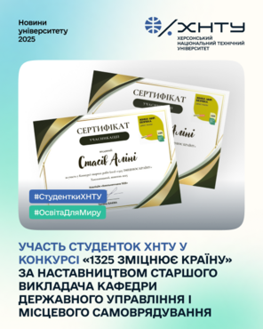 З 16 вересня по 10 жовтня 2025 року студентки Херсонського національного технічного університету Лазаренко Аліна (група 5 ФП, факультет міжнародних економічних відносин, управління і бізнесу) та Стасів Аліна (група 4Д-3, факультет інформаційних технологій та дизайну) під керівництвом старшої викладачки кафедри державного управління і місцевого самоврядування Фролової М. Е. взяли активну участь у конкурсі творчих робіт «1325 зміцнює країну» і стали його фіналістками.