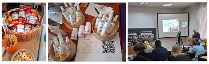 Цікавим було спілкування зі стейкхолдерами косметичної галузі, що виробляють продукцію для здоров’я та краси людини: технологом виробництва ТОВ «Біоконтакт» м. Київ, який представив продукцію БактоVIT (ПП «Кронос агро») для нормалізації мікрофлори шлунково-кишкового тракту, а також косметичні маски для обличчя з пребіотиком, косметичний крем і тонік насичені корисними молочнокислими бактеріями; власницею крафтового виробництва натуральної косметики FLOYA тоніків-гідролатів, сухих масок убтанів, ефірних олій із української сировини.
