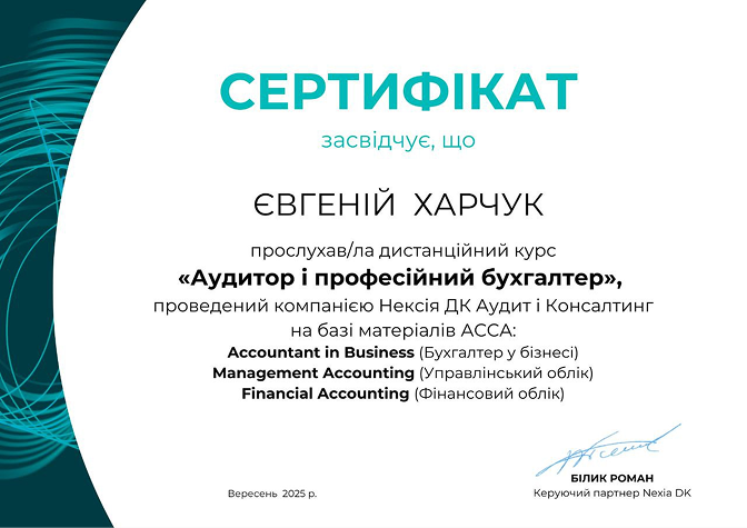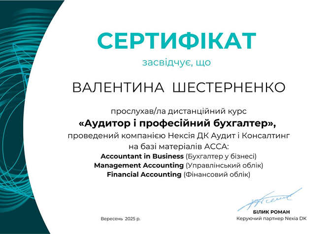 У вересні 2025 року здобувачі першого (бакалаврського) рівня вищої освіти спеціальності D1(071) «Облік і оподаткування» Євген ХАРЧУК і Валентина ШЕСТЕРНЕНКО успішно пройшли дистанційний онлайн-курс «Аудитор і професійний бухгалтер».