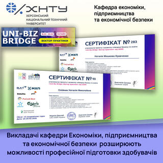 Викладачі кафедри економіки, підприємництва та економічної безпеки ХНТУ – доц. Олійник Наталія та старший викладач Мєшкова-Кравченко Наталія – долучилися до участі в освітньо-професійному проєкті «Uni-Biz Bridge: вектор практики». Проєкт став дієвим інструментом взаємодії між академічною спільнотою та провідними компаніями України (ВАТ Україна, Deloitte, МХП, Carlsberg Ukraine, НБУ, PwC Ukraine). Протягом інтенсиву було опрацьовано найсучасніші управлінські методики, впровадження яких у лекційні курси та практичні заняття для майбутніх економістів та соціальних працівників планується найближчим часом.