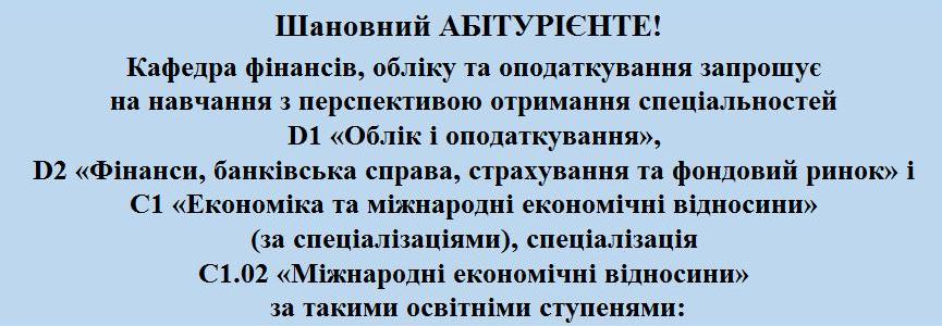 Структура / Кафедри університету / Фінансів, обліку та оподаткування / Інформація для абітурієнта