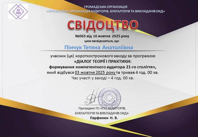 Участь доцента кафедри фінансів, обліку та оподаткування Тетяни ПІНЧУК у Всеукраїнському круглому столі сприяла обміну професійним досвідом, поглибленню розуміння сучасних тенденцій розвитку аудиторської освіти і практики. Отримані знання будуть використані у подальшому викладанні обліково-контрольних дисциплін та вдосконаленні підготовки здобувачів кафедри фінансів, обліку та оподаткування.