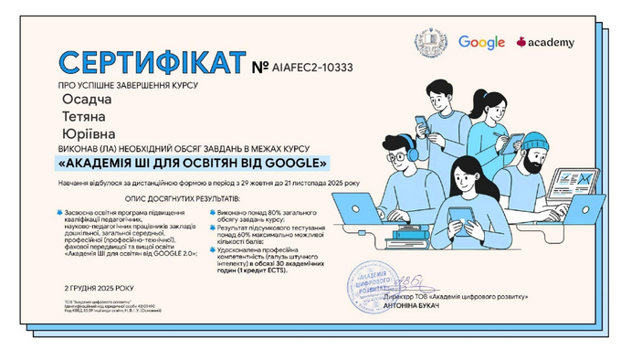 Завідувач кафедри фінансів, обліку та оподаткування Лариса СІДЕЛЬНИКОВА, доцент Олена НОВОСЬОЛОВА та викладач-стажист Тетяна ОСАДЧА взяли участь у програмі підвищення кваліфікації педагогічних та науково-педагогічних працівників закладів вищої освіти «Академія ШІ для освітян 2.0 від Google», яка тривала у період