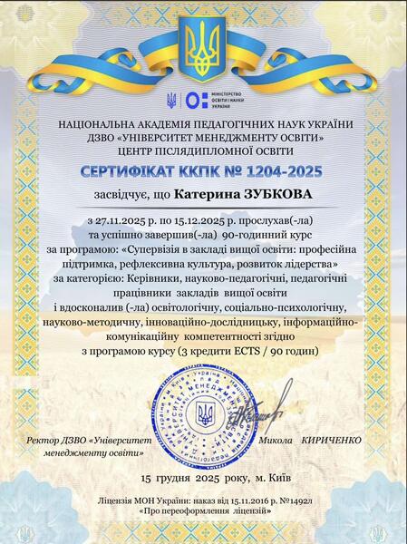 У період з 27 листопада по 15 грудня 2025 року доцент кафедри харчових технологій Зубкова Катерина Віталіївна пройшла та успішно завершила 90-годинний курс (3 кредити ECTS) у ДЗВО «Університет менеджменту освіти» (Центр післядипломної освіти) в межах програм підвищення кваліфікації, що реалізуються за підтримки Міністерства освіти і науки України.