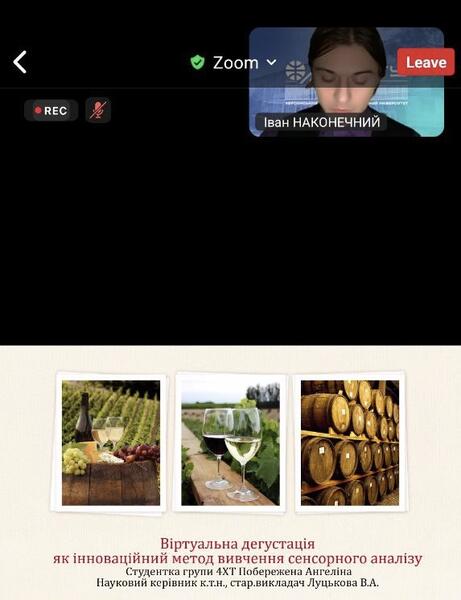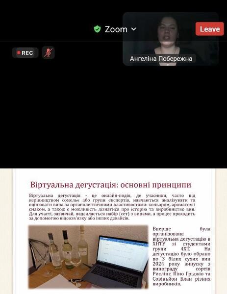 У заході представила свою роботу студентка групи 4ХТ Побережна Ангеліна з темою:«Віртуальна дегустація як інноваційний метод вивчення сенсорного аналізу». Дослідження присвячене впровадженню цифрових технологій у процес формування сенсорних навичок майбутніх фахівців харчової галузі, зокрема використанню віртуального середовища для моделювання дегустаційних умов, оцінювання органолептичних показників та підвищення об’єктивності сприйняття.