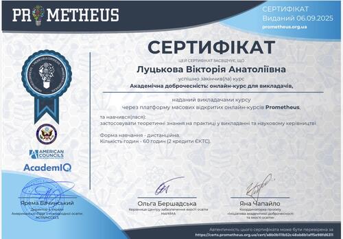 У вересні 2025 року к.т.н., старший викладач кафедри харчових технологій Луцькова Вікторія Анатоліївна пройшла онлайн-курс «Академічна доброчесність: онлайн курс для викладачів», розроблений на освітній платформі Prometheus.