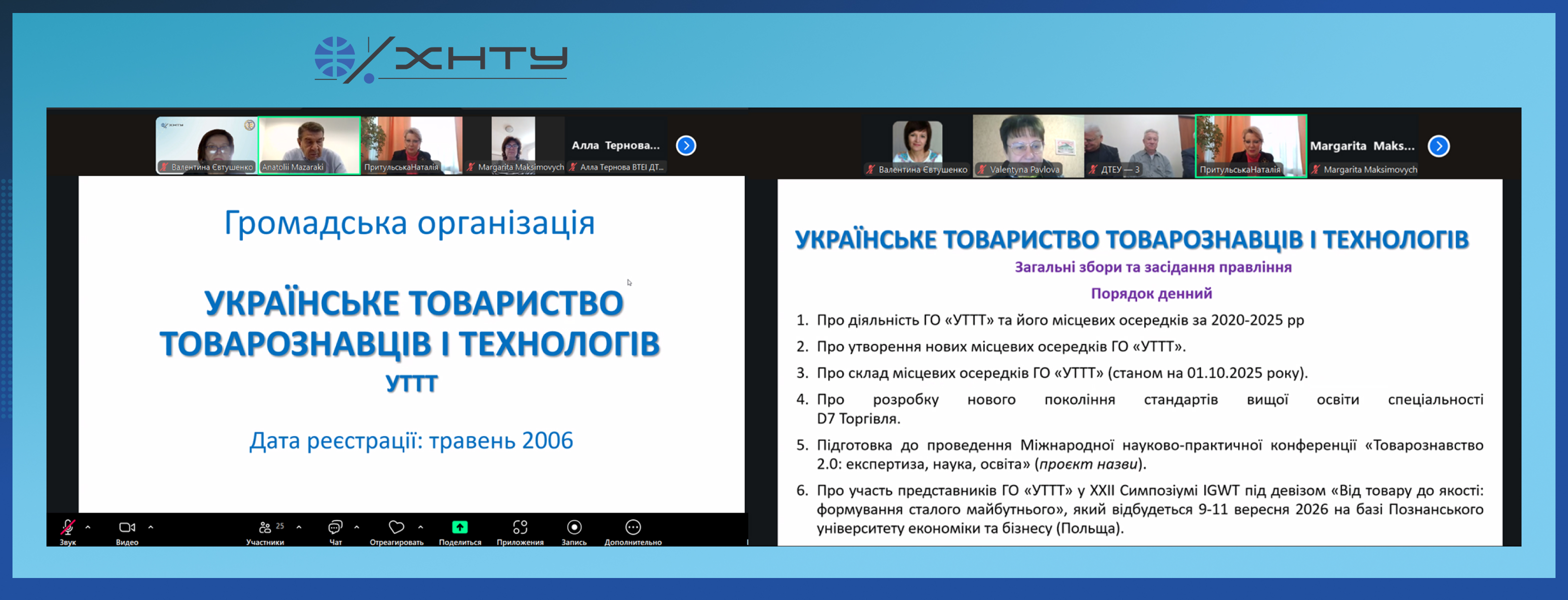 У зборах прийняла участь Голова Херсонського осередку ГО «УТТТ», завідувач кафедри товарознавства, стандартизації та сертифікації к.т.н., доцент Валентина Євтушенко, яка представила регіональні ініціативи, спрямовані на розвиток освітньо-наукової діяльності та інтеграцію стандартів якості в умовах сучасних викликів.