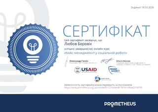 Зокрема, викладачка завершила онлайн-курс «Кейс-менеджмент у соціальній роботі» на платформі Prometheus, розроблений Благодійним фондом Право на захист. Програма курсу була спрямована на формування практичних навичок роботи з вразливими категоріями населення, зокрема: оцінювання потреб клієнтів, розроблення індивідуальних планів підтримки, координацію соціальних послуг та моніторинг результатів . Отримані знання є особливо актуальними в умовах зростання потреби у якісних соціальних послугах. |