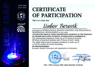 Крім того, Любов Боровік взяла участь у міжнародному науково-педагогічному стажуванні «Innovative Digital Tools for Distance Learning in the Training of Higher Education Students: International Experience», організованому International Science and Education Project за участі Instytut Spraw Administracji Publicznej (м. Люблін, Республіка Польща). У межах програми було опрацьовано сучасні цифрові інструменти дистанційного навчання, що дозволяють підвищити ефективність освітнього процесу, а також інтегрувати міжнародний досвід у підготовку здобувачів вищої освіти. |